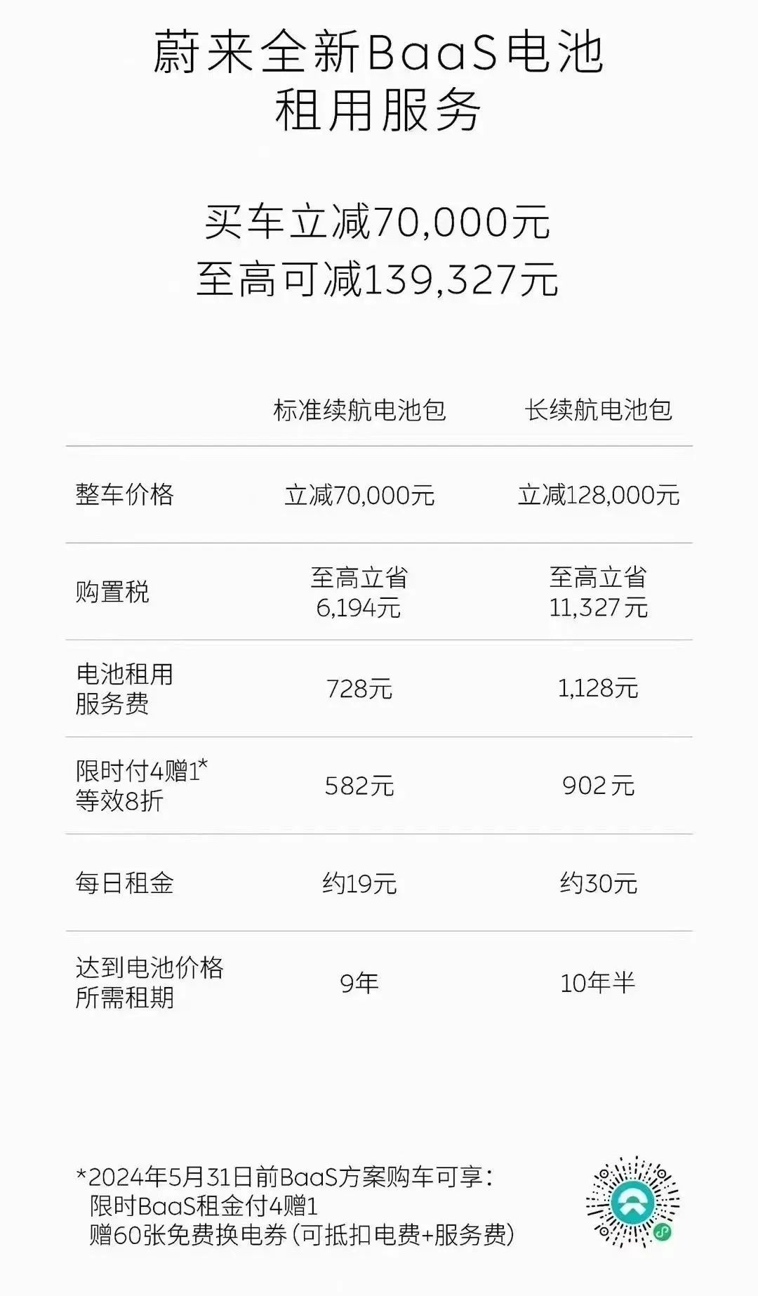 按照最新的BaaS方案,标准续航电池包租用服务费从980元/月调整至728元/月,长续航电池包租用服务费从1680元/月调整至1128元/月;现有用户和新用户所支付租金可部分抵扣电池买断费用;用户每支付一期账单,即获赠一张100元焕新礼金券,复购时可直接抵扣新车款。蔚来当日还宣布,即日起至5月31日,用户选择BaaS方案购车,还可享电池租用服务费付4赠1、60张免费换电券赠送的限时礼遇。
