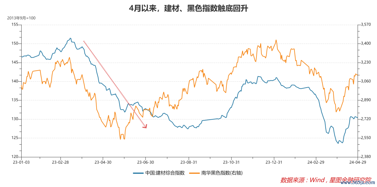 除地产外,通缩阴影是另一个压制市场情绪的变量。1季度,PPI同比下降2.7%,名义GDP仅同比增长4.2%,微观主体体验较差。4月政治局会议明确要求要及早发行并用好超长期特别国债,加快专项债发行使用进度,5月以后,专项债发行有望提速,超长期国债也有望更快落地,将对基建投资形成支撑。4月以来,黑色系、建材价格指数已经触底回升,叠加基建提速和低基数效应,对PPI的拖累有望迅速收窄,带动PPI增速触底回升,提振市场风险偏好。
