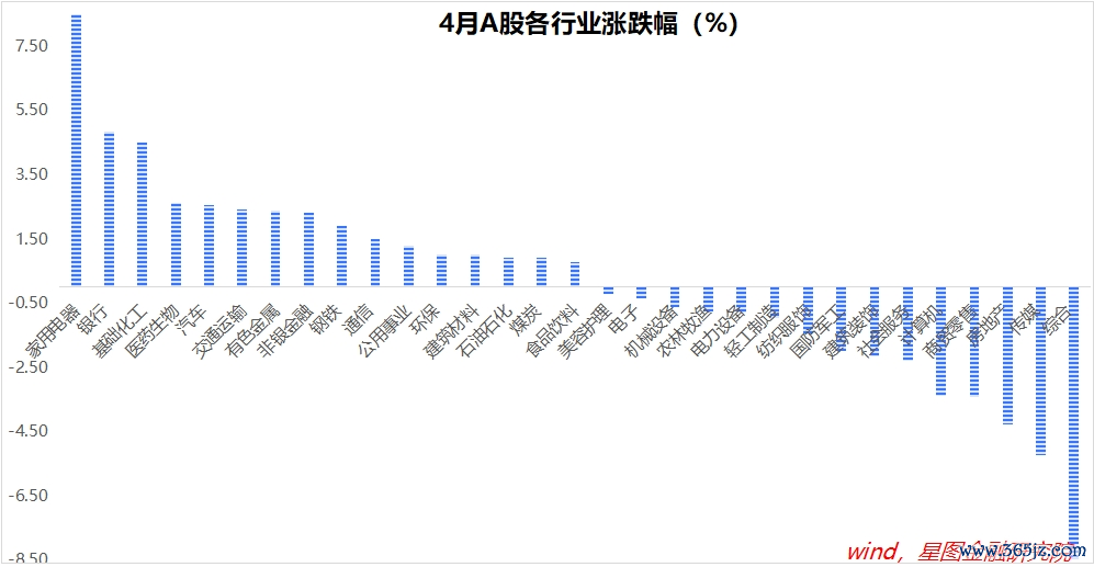 从行业涨幅排名看,4月与前4月涨幅高度重合,均是家电、银行、有色金属领涨,计算机、房地产、商贸零售等跌幅靠前。