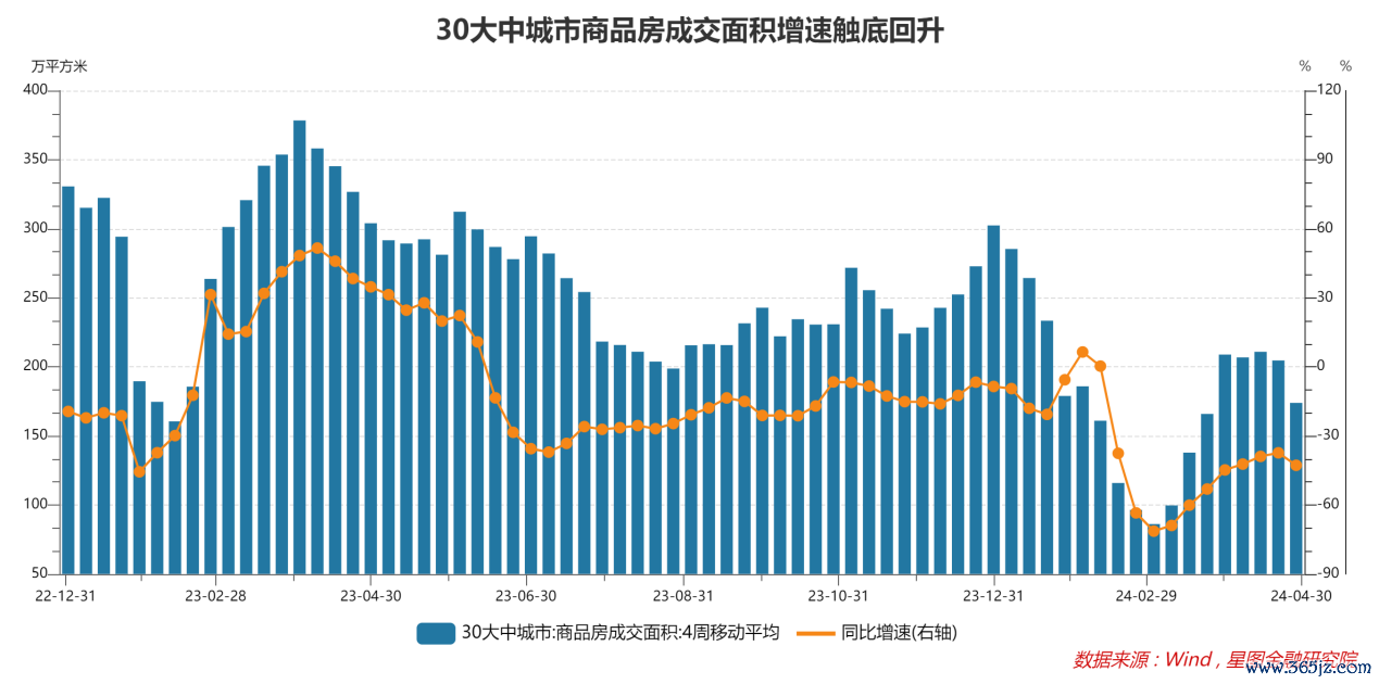 进入二季度,地产刺激政策继续加码,更多一二线城市开始放松限购、限价,对商品房销售面积形成支撑。4月底政治局会议首提消化存量、优化增量,更多需求端政策有望出台。从基数角度看,商品房销售面积于去年4月前后见到相对高点,之后快速回落。受益于政策刺激和基数效应,5月以后,商品房销售面积同比降幅有望快速收窄。